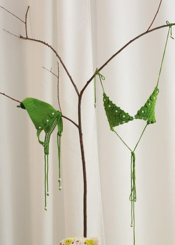 Set hecho a mano en crochet con hilo de algodón orgánico. Color base verde con aplicaciones florales. Detalles bordados con piedras naturales que aportan un toque único y artesanal.